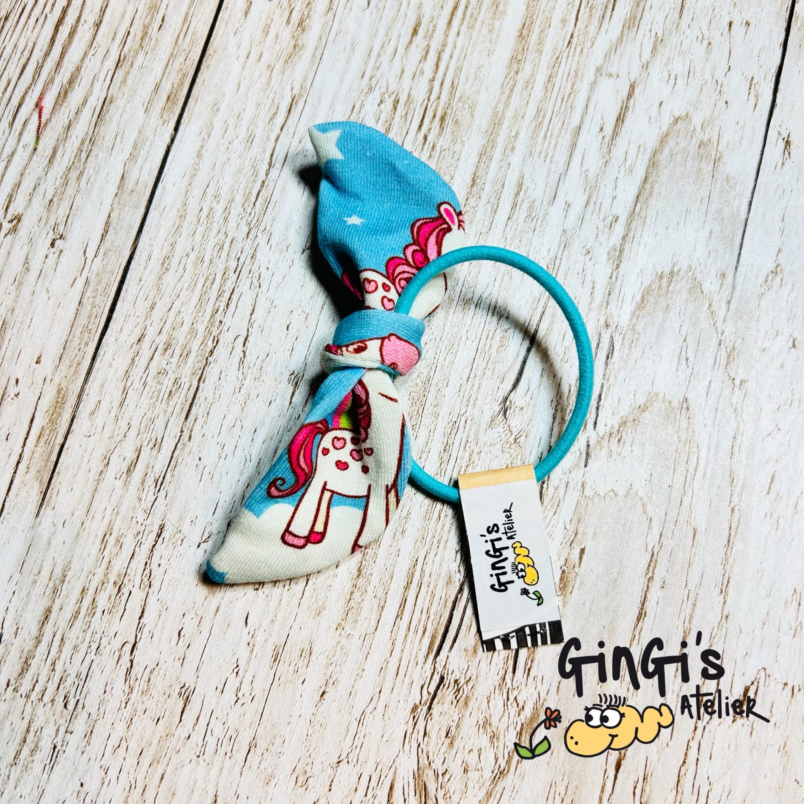 Wenn der Gummi kaputt wird, kann man die Jerseymasche einfach auf einen neuen Haargummi knoten.